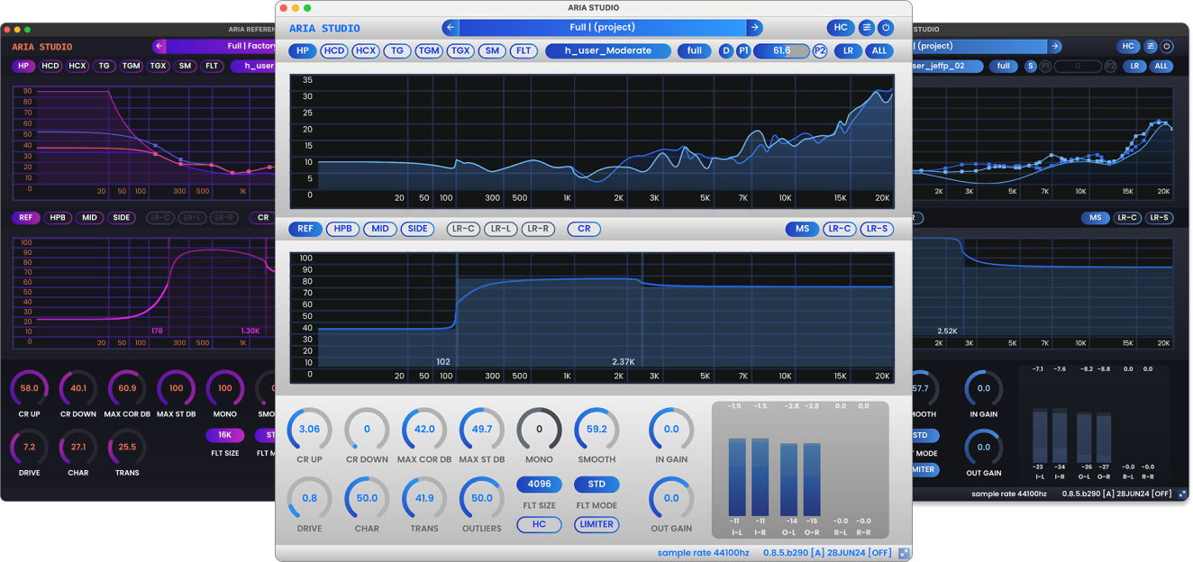 Tailor ARIA precisely to your needs with three unique operating modes, each embodying a different psychoacoustic approach to sound refinement. Whether you prefer Middle/Sides processing, Left-Right Linked, or Left-Right Decoupled, ARIA provides flexibility, catering to a wide range of preferences and use cases.